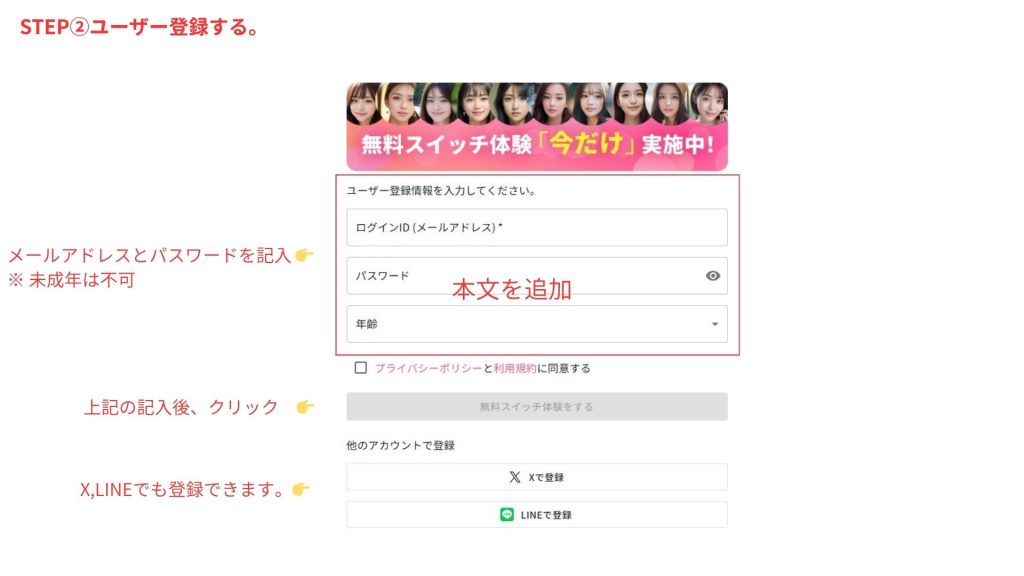 未成年者は利用できません。登録時に年齢確認・規約同意が求められます。
