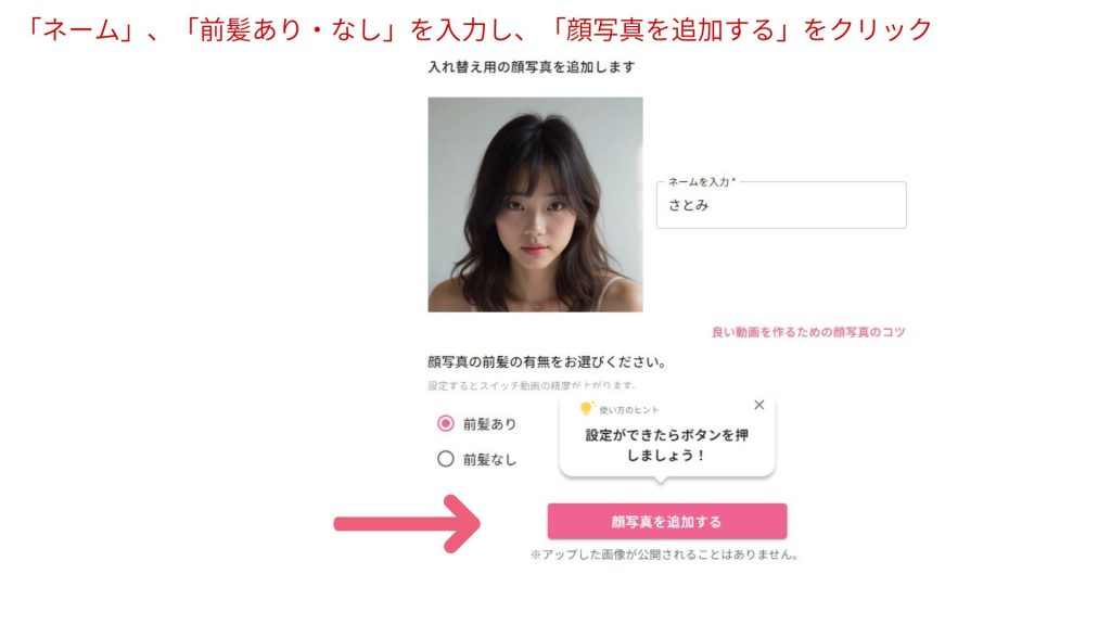 - 2〜3枚登録してAIの学習を助けると、より自然な合成に